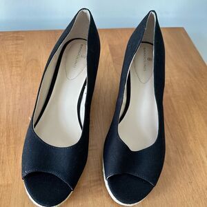 Stylish black wedges with a tan espadrille heel. Perfect for casual or dressy occasions.