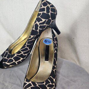 Bandolino Brown Tan Giraffe Print Peep Toe 3" Heel Fabric Dress Pumps Size 6.5M