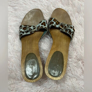 Bandolino Buckle Blue Brown Leopard Print Faux Fur Wood Clog Heels Women’s Size 8.5.