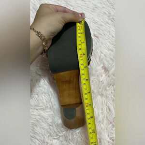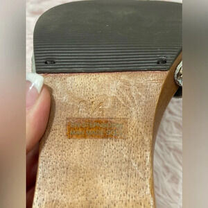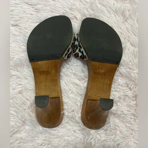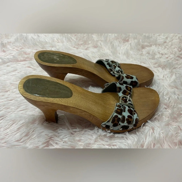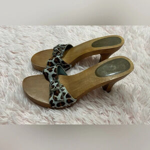 Bandolino Buckle Blue Brown Leopard Print Faux Fur Wood Clog Heels Women’s Size 8.5.