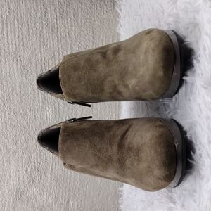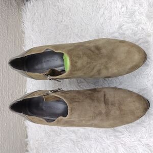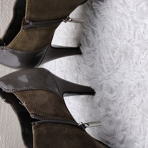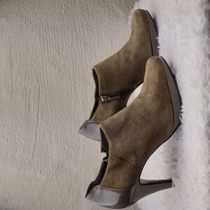 Bandolino Cardinal Taupe Suede Patent Leather Almond Toe High Heel Ankle Bootie