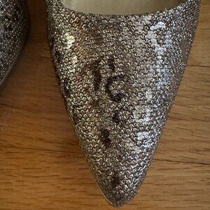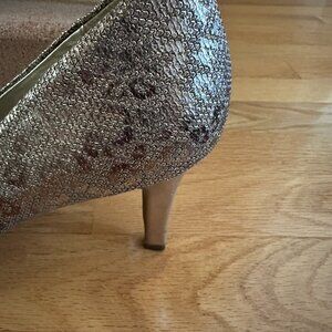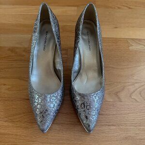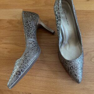 Bandolino Fawn Animal Print Sparkly Pumps. Pointed closed toe pumps with sparkly silver man-made material. Fawn or animal print. Textile upper. Balance man-made. Silver-toned heels. Excellent pre-owned condition. Minimal wear. Some spots on the interior on the back heel area. Some scuffs on the heels. See the last 2 pictures. Approximate 3.25" heel. Size 9.5M