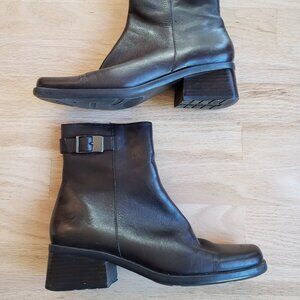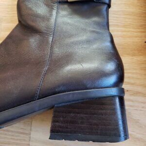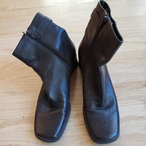Bandolino genuine leather ankle boots with zipper on side. Decorative buckle/strap.1.5 inch heel. Good used condition. Leather upper in very good condition. Very slight wear on heels. See pictures provided.