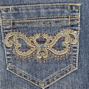 Back pockets are embroidered and have metalic rhinestones.
