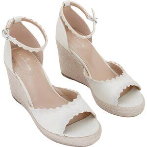 Chic wedge espadrilles with scalloped straps and adjustable ankle closure. Neutral ivory hue elevates warm-weather outfits. Design shown clearly in photos.