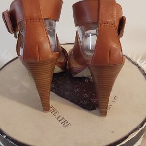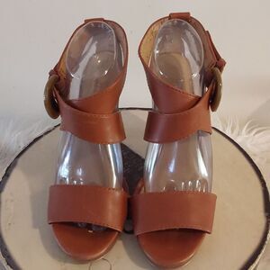Carmel Color Leather ..Wrap around bucket Strap open toe sophisticated classy to jeans to dresses ..Slight peeling on inner straps..Excellent quality