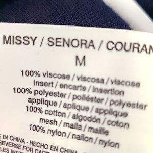 * Navy blue tunic top with embroidered applique in the front about 4" above the hemline