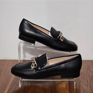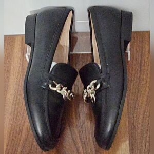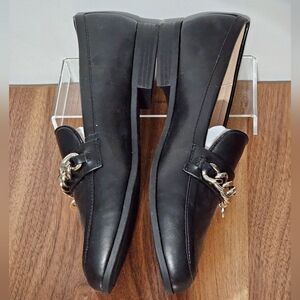 Done in a black loafer style with a goldtone chain and charm across the top of each foot.