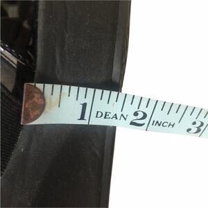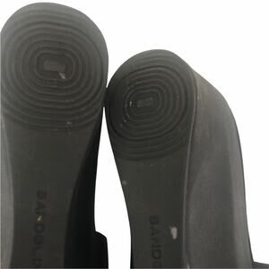 Size 8 1/2, wedge, black faux leather plus elastic bands across top, slide in