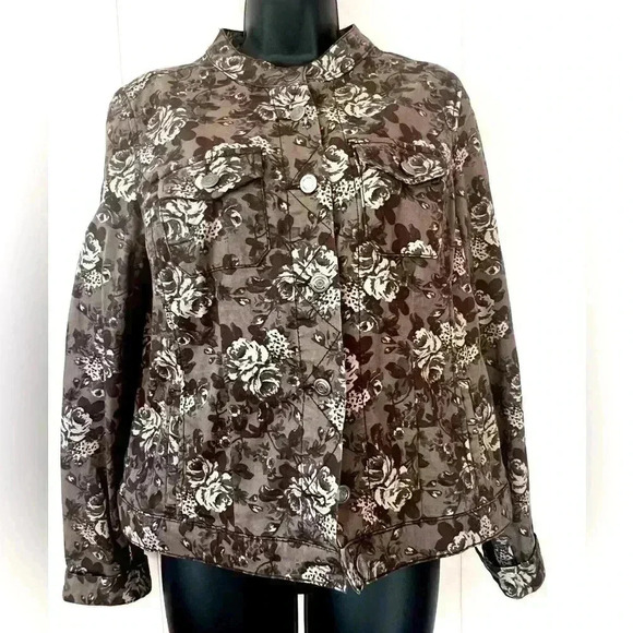 Bandolino Women's Sz M Denim Softer Denim Jacket Collarless Rose Print