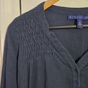 The Bandolino Women's XXL Popover V Navy Blouse is a versatile and comfortable top perfect for casual occasions. Made from lightweight and breathable cotton, this blouse features long sleeves with roll tab accents and a V-neckline for a stylish touch. The pullover closure and regular fit make it easy to wear, while the solid navy color adds a classic touch to your outfit. Pair this blouse with your favorite bottoms for a relaxed and stylish look that is perfect for nature-inspired themes or a boho chic style. Pit to pit measures 25" laying flat and shoulder to hem 28".