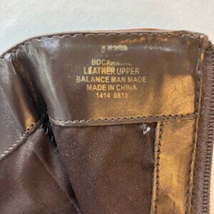 Bandolino leather riding boots rich brown base with chestnut brown banding at top. Brass detailing on ankle strap and top of boot. Small heel. Side sipper. Size 7.5