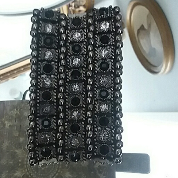 Jeweled stretched bangle with diamond and black colored stones. Huge statement but a very comfortable piece. I won the from Mary Kay. 2 inches wide and will fit any wrist I believe.