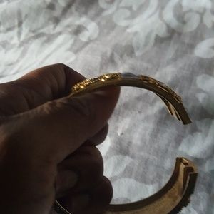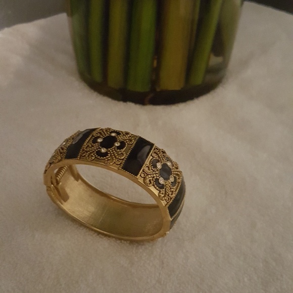 Black and gold with rhinestones. It have retractable claps for easy fit.