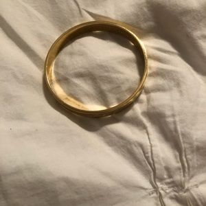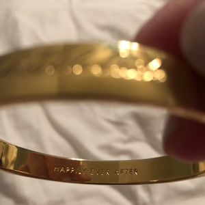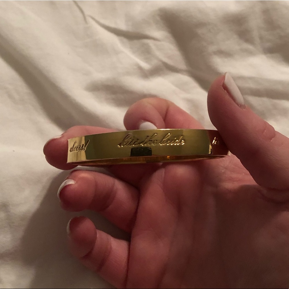 12 karat gold plated Kate Spade idiom bangle. Multiple inscriptions: Cue the confetti, cheers!, Kiss the bride, tie the knot, toss the bouquet, cut the cake. The inside reads happily ever after.