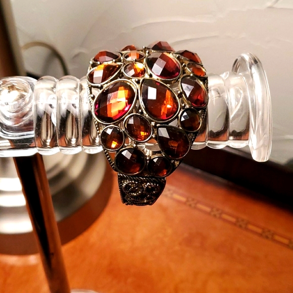 Bangle with amber color Crystal stones bracket has a spring latch.