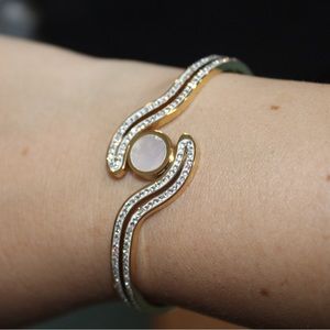 Stainless steel gold plated bangle with cz stones and mother of pearl