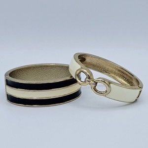 Bangle Bracelet Vintage Black Cream Enamel Set of Two Striped Open Link Clamper