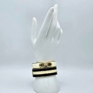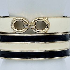 Bangle Bracelet Vintage Black Cream Enamel Set of Two Striped Link Clamper. Unsigned. 7 1/4". Striped Bangle is 3/4". Open Link bracelet is 1/2". In good pre-owned condition.