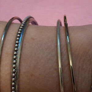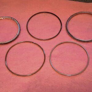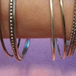 What we have here is a set of five thin, multi-design bangle bracelets, most likely made of stainless steel. Stainless steel offers tarnish resistance. One of the fixed bracelets features a beaded design on top of the metal base. Another bracelet is an expandable bracelet with a basket weave style. The remaining three are simple clean faced linear closed loop bracelets They can be worn individually or in groupings as statement pieces. The bangles as displayed are shown on a 6 inch wrist with room to spare. Bangle bracelets remain a timeless and popular jewelry choice, with stackable styles and mixed-metal looks being particularly on-trend.