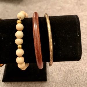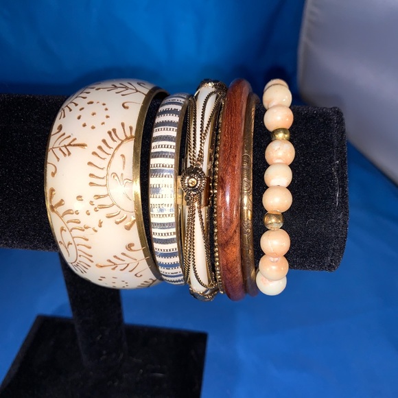 Moroccan style bangles, a set of 7 pieces. 2-1/2” diameter. 24k, brass, ivory and wood.