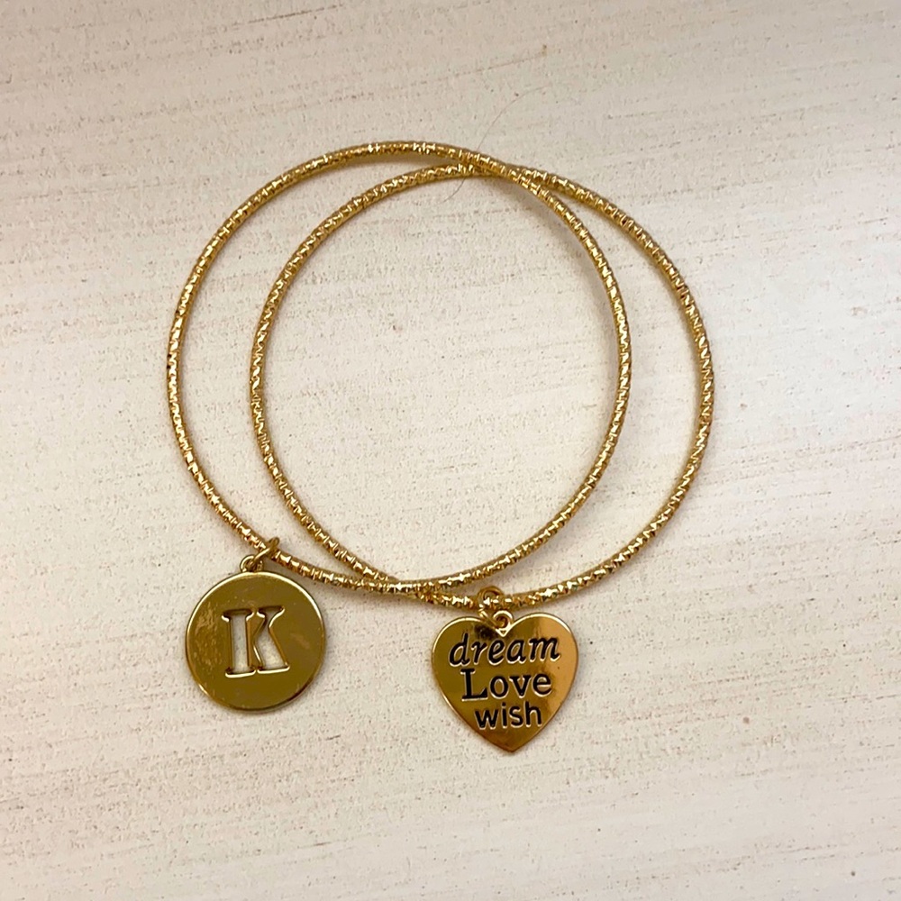 Gold bangle set, NWOT. One is a “K” initial bangle the other is a heart w “Dream love wish” on it.
