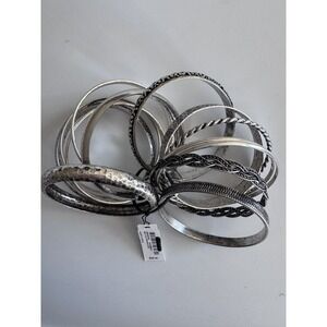 This is a fashion bracelet bangle set in silver. The designs include hammered, arrow, floral, and exaggerated hexagram motifs. It has a retro and beauty theme, made in China. The bracelet is round in shape and does not feature any stones.