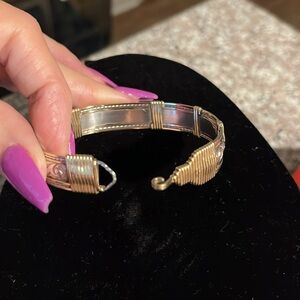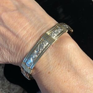 Vintage Bengle bracelet, beautiful design gold plated does not have a stamp, but it is real. I’ve had it for a long time. I believe it will fit a 6.5 to7 inch wrist easy to put on hook clasp gorgeous unique design 300.00 firm on price.