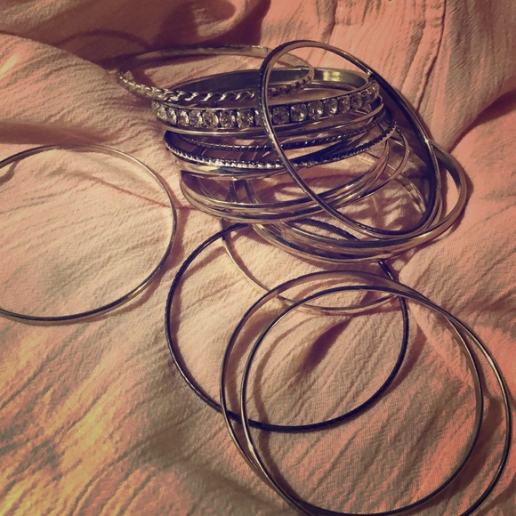 17 silver bangle bracelets, some have crystals