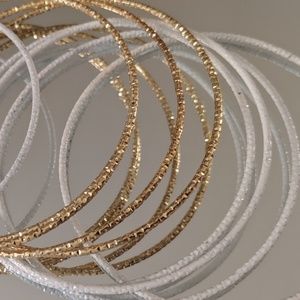 Five white Bangles and four gold Bangles. Fun accessory to mix n' match with other bracelets. NWOT