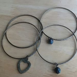 4 bangle bracelets 1 with heart charm 2 with black beads and one plain