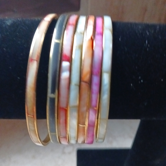 Seven brass and mother of pearl bracelets. 9 in in diameter but feels like more of an eight.