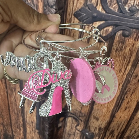 3 breast cancer awareness bangles with charms. Would make a great gift 🎁