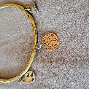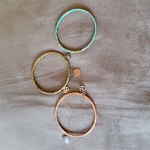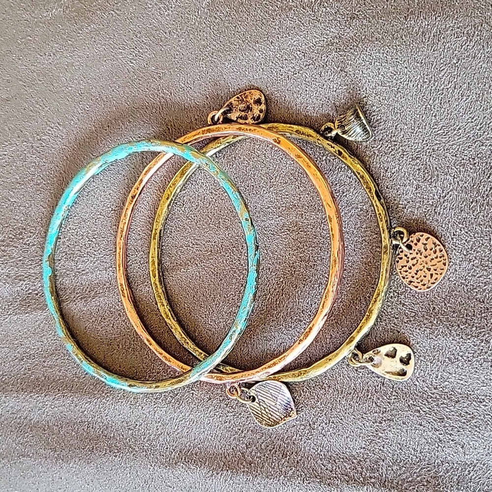 Three bangle bracelets, two with decorative charms hanging off. Wear is part of design.