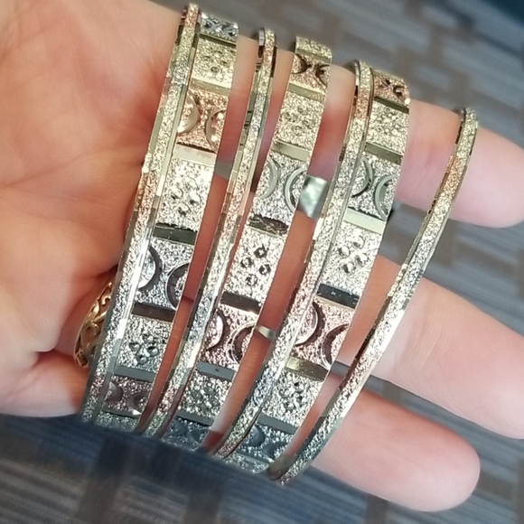 Gold plated. 3 color. Bangle set. 8.5"dia. 2.75" across. Diamond cut design. Have 5 other designs listed....