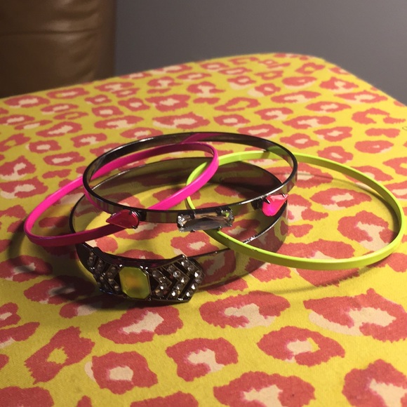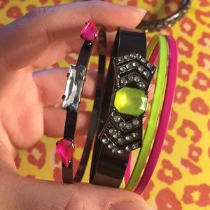 Has some wear. Neon yellow, neon pink and gun metal bangles with detailing. Slight chipping