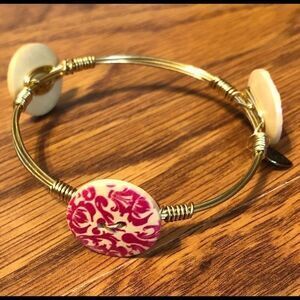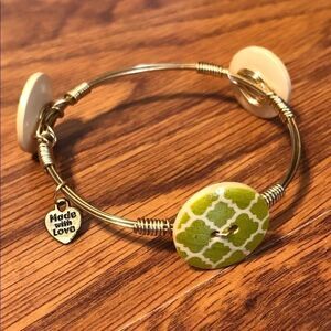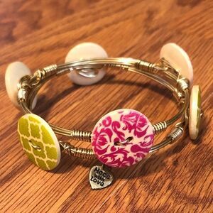 Set of 2 gold bangle bracelets. One bracelet has 3 wooden buttons with green lattice print & the other has 3 wooden buttons with pink damask print. Both have a gold heart charm that says made with love. Buttons are 3/4” wide. Boho