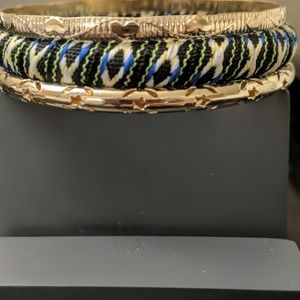 Beautiful bangle bracelets. Three bracelets all together. Two gold-colored bracelets and one woven pattern. Fun to mix n' match with additional bracelets.