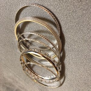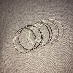 stack of 7 silver colored bangles, used once, different designs