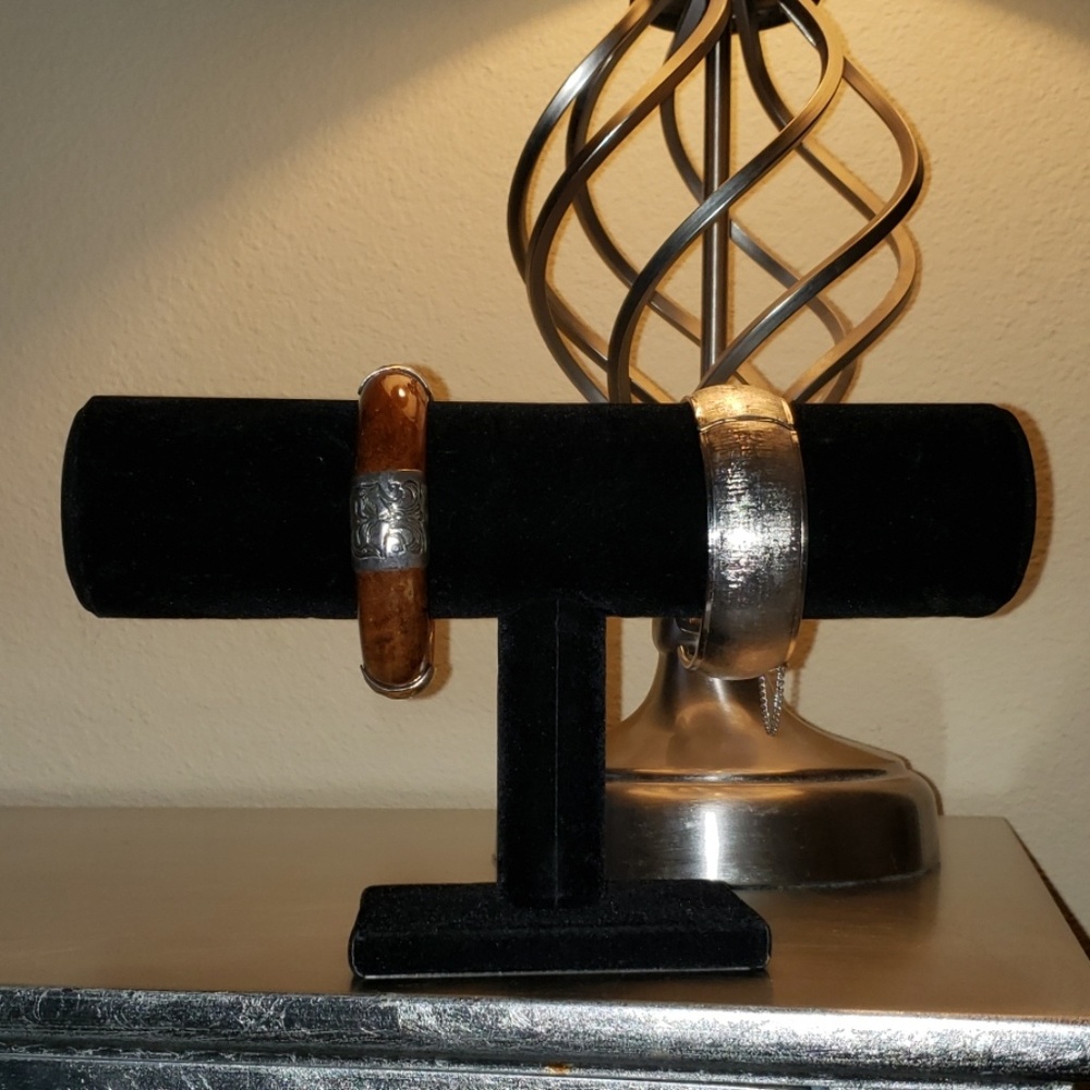 Solid silver bangles Solid wooden with silver accents along it.