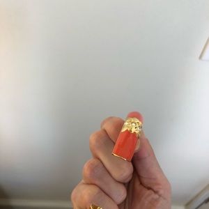 All 5 bangles $30 3 small gold bangles ($10/3 or $5/each) White and gold claps bangle ($10) Coral and gold clasp bangle ($10)