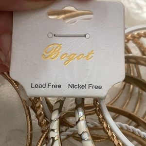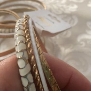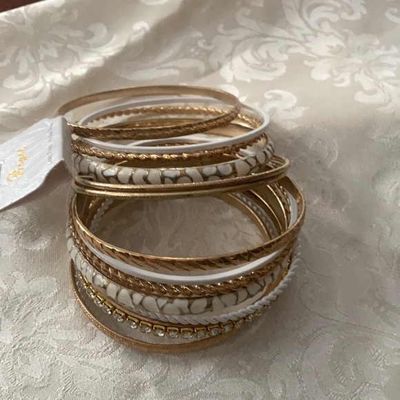 15 gold and white Bracelets .2 white pattern, 2 thin plain white, 2 thin rope designs,4 medium pattern in gold, 2 thin plain gold, 1 gold rope designs, 1 cubic fake diamonds