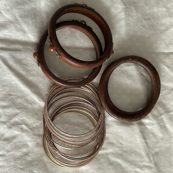 There are 4 wood bracelets 2 havejewel accents, and there are 11 metal bracelets very boho chic