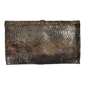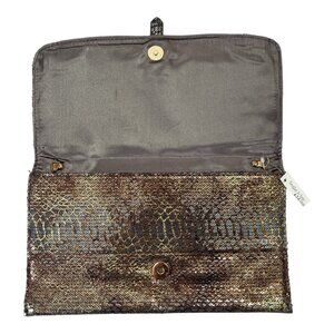 Chic early 2000s Bangles & Bags clutch featuring a metallic sequin design in shimmering bronze, gold, and silver tones. The foldover silhouette is accented with a slim strap and gold-tone hardware, secured by a magnetic snap closure. Fully lined in smooth satin with an interior zip pocket and side D-rings for an optional strap. A perfect Y2K-era statement piece for parties, weddings, or evening wear.