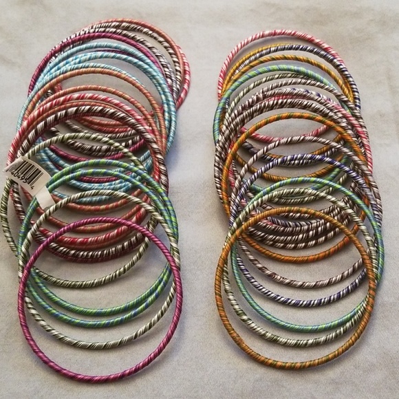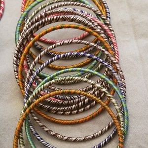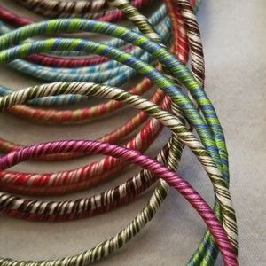 Multi colored thread wrapped bangle bracelets. These are great to mix and match colors- even add to other bangles you already own! They are wrapped in color thread- in perfect condition. Also, the thread wrap makes them quiet.