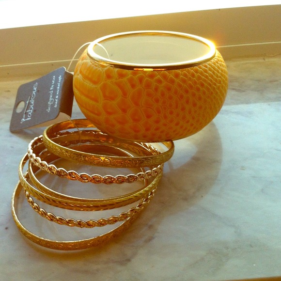 Fabulous set of 6 gold bracelets and 1 larger yellow snake skin pattern bangle with tag still attached! perfect for summer !