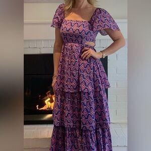 Side cutouts bring an of-the-moment feel to this Banjanan dress, which features a tiered silhouette and one of the label's signature vibrant prints.