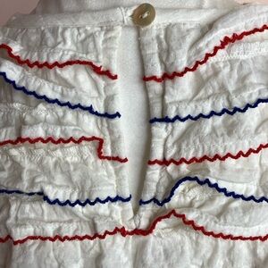 Long sleeves with blue and red edged ruffles on front and back.