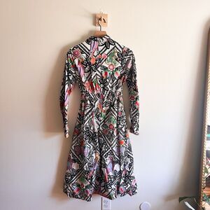 Title in color. The Daffodil dress is an easy, elegant shirtdress in this season's Folk Lace printed crisp cotton poplin, inspired by handmade lace and decorated with magical bird illustrations. Fastened through the bodice with a front button placket, the Daffodil's gathered waist falls from an elasticated waist with an attached self belt. Features side-seam pockets.