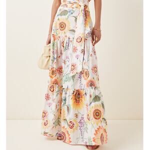 Banjanan Discovery Skirt in Mid Summer Bumble White. Size XS / Extra Small. Features floral print throughout, a-line silhouette, banded waist with self tie closure at front, high waist, side zipper closure, tiered, long maxi length. 100% cotton. Excellent condition, no flaws. Rare print!